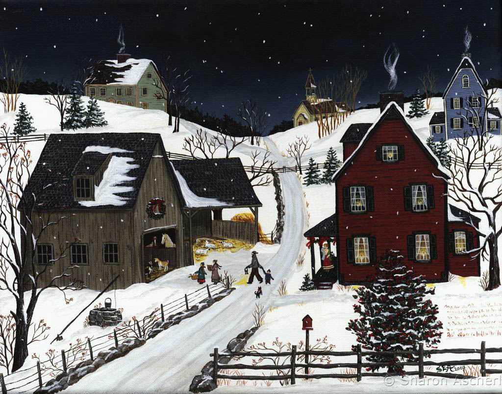 It is a cold Christmas eve. The animals in the barn have not been forgotten. Papa and the children are taking them treats while Mama watches from the front porch with the baby...