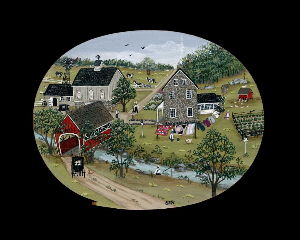 This is a very typical scene in Pennsylvania Amish country. Mama is hanging her laundry and quilts out to dry. Papa and his son are cleaning the barnyard. A boy is taking a break from chores to fish in the stream...