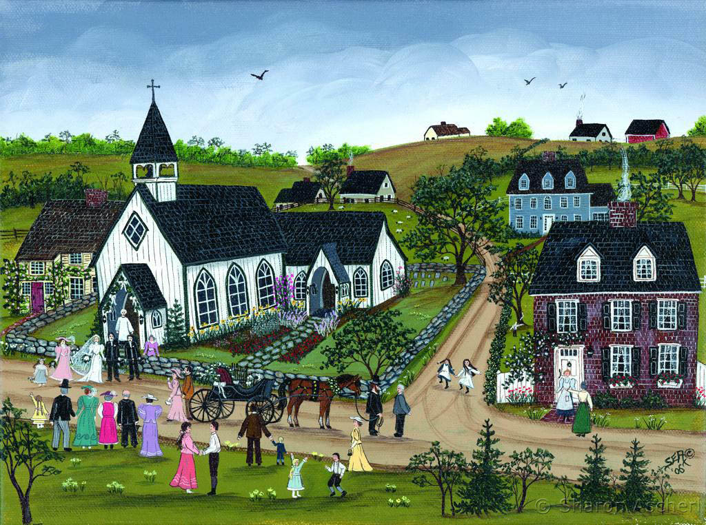 The little country church is where Lilly was married. The young couple holding hands in the foreground are dreaming of th day they will marry. The inspiration for the church in this painting comes from St Paul's Anglican Church in Crownsville, Maryland...